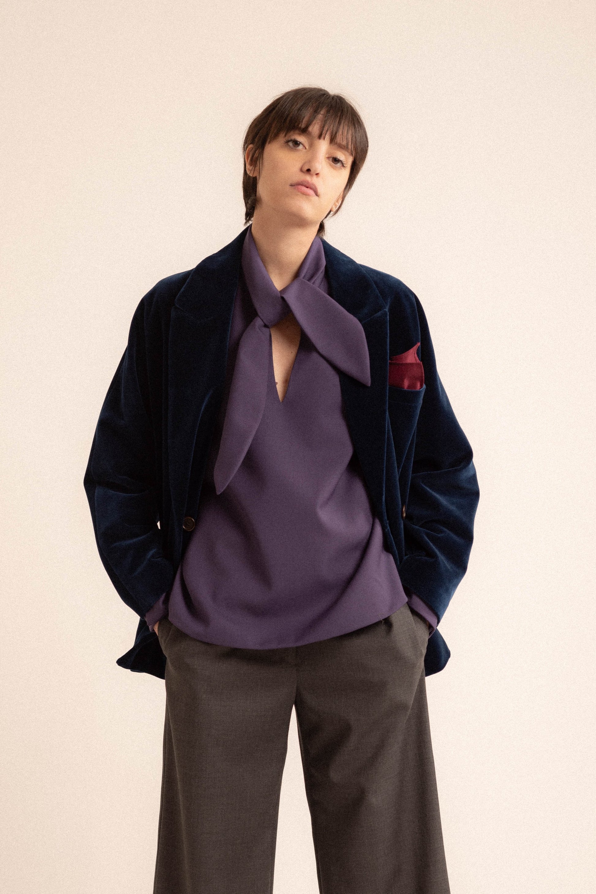Questa blusa in fresco lana color mirtillo di tareastudio è l'emblema dell'eleganza senza tempo, arricchita da dettagli raffinati che la rendono unica. Il fiocco al collo, che ricorda un foulard delicato, aggiunge un tocco di femminilità e sofisticazione al capo, rendendolo perfetto sia per outfit formali che per occasioni speciali. I polsini alti donano una struttura elegante alle maniche, conferendo un carattere distintivo alla blusa.