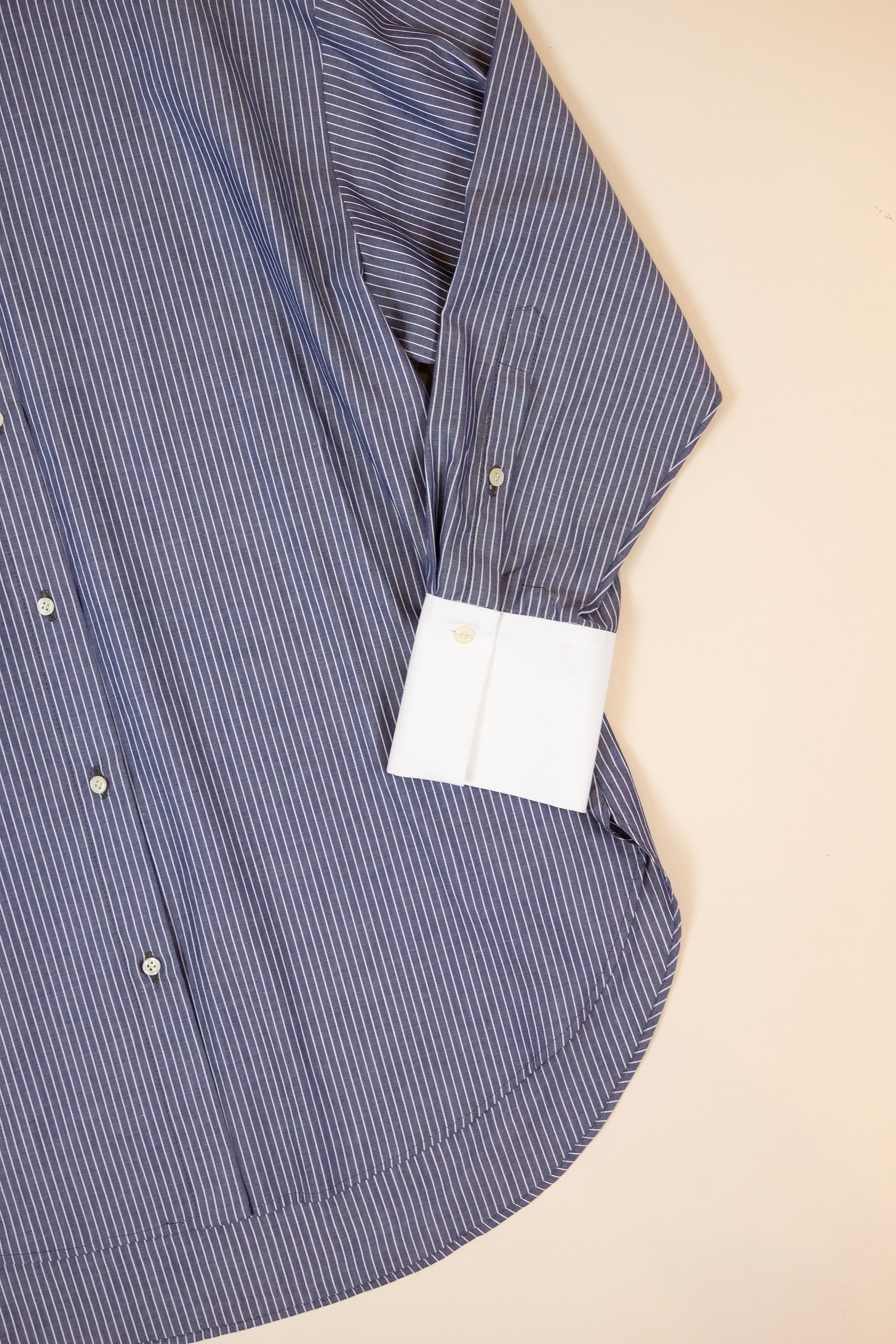 Design lungo, costruzione ampia con spalla scesa. Collo alla coreana con rouches applicata. Polsini alti in popeline bianco, pensati per essere risvoltati. Abbottonatura frontale. Fondo leggermente stondato.