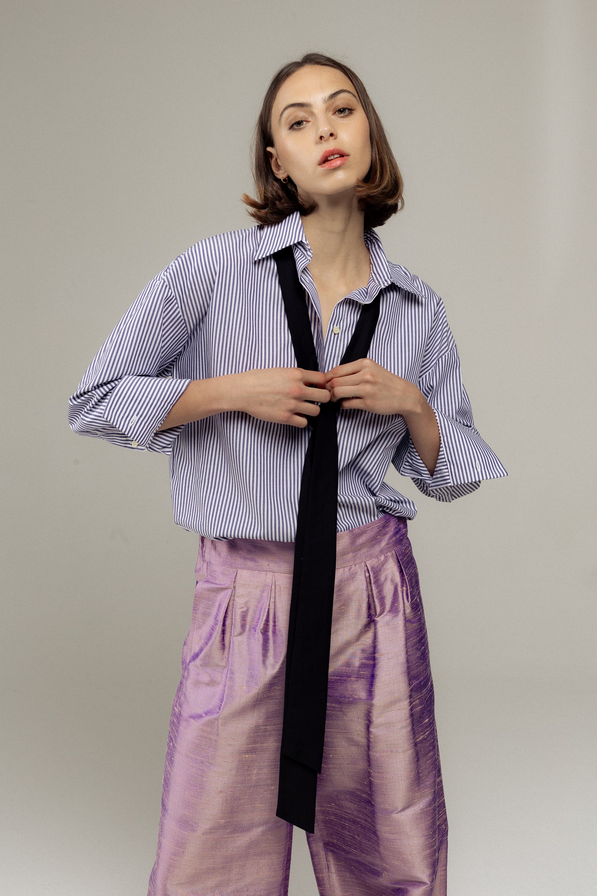 Tessuto asciutto, costruzione ampia con spalla scesa. Collo classico. Cravattino removibile in contrasto nero. Abbottonatura frontale, polsi alti con bottoni. Fondo leggermente stondato.