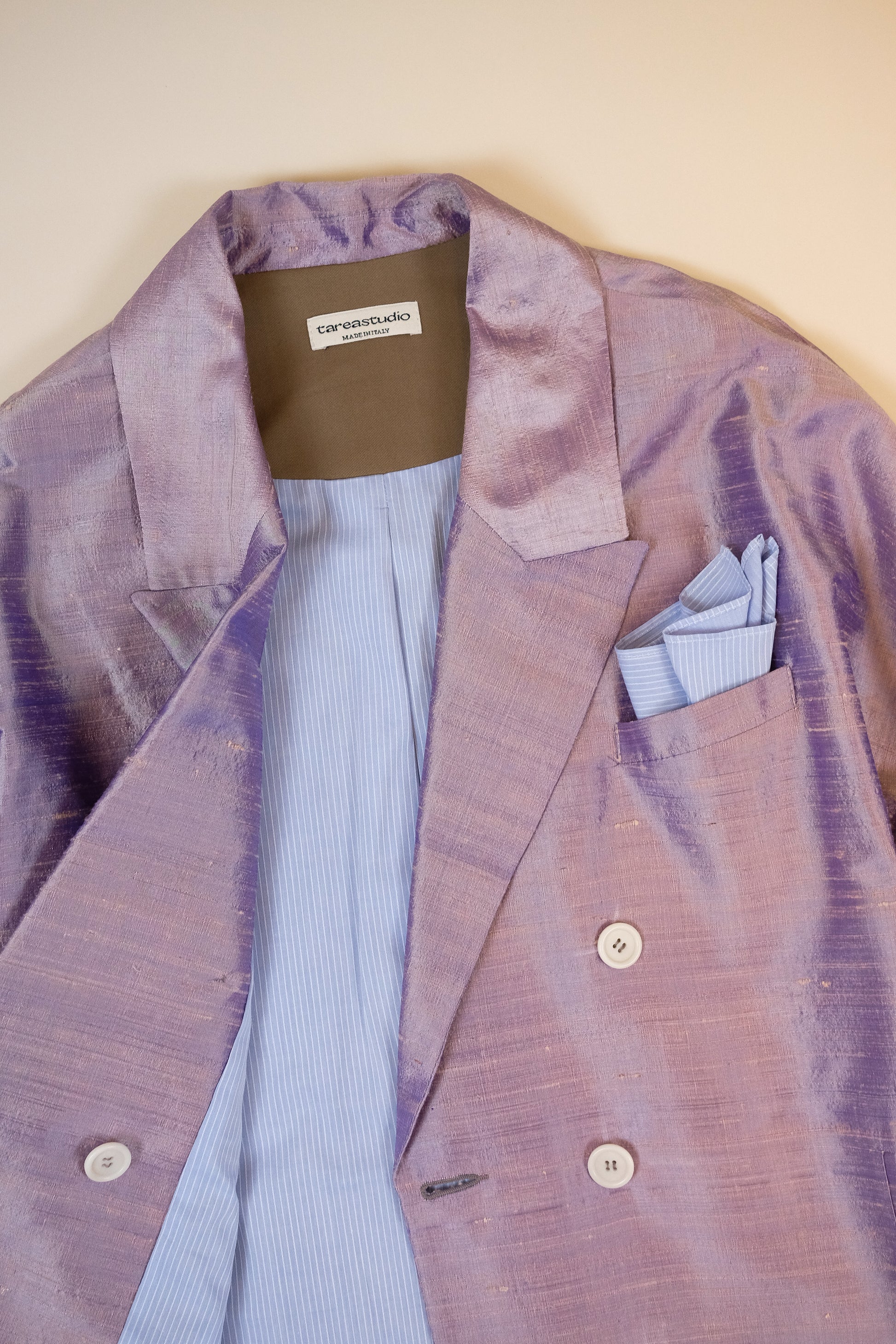 Esterno in pregiato rasatello Shantung di seta. Foderata in popeline di cotone a righe. Costruzione morbida, priva di spalline. Bottoni in corozo a 4 fori, color naturale. Tasche laterali verticali e taschino frontale con pochette coordinata.