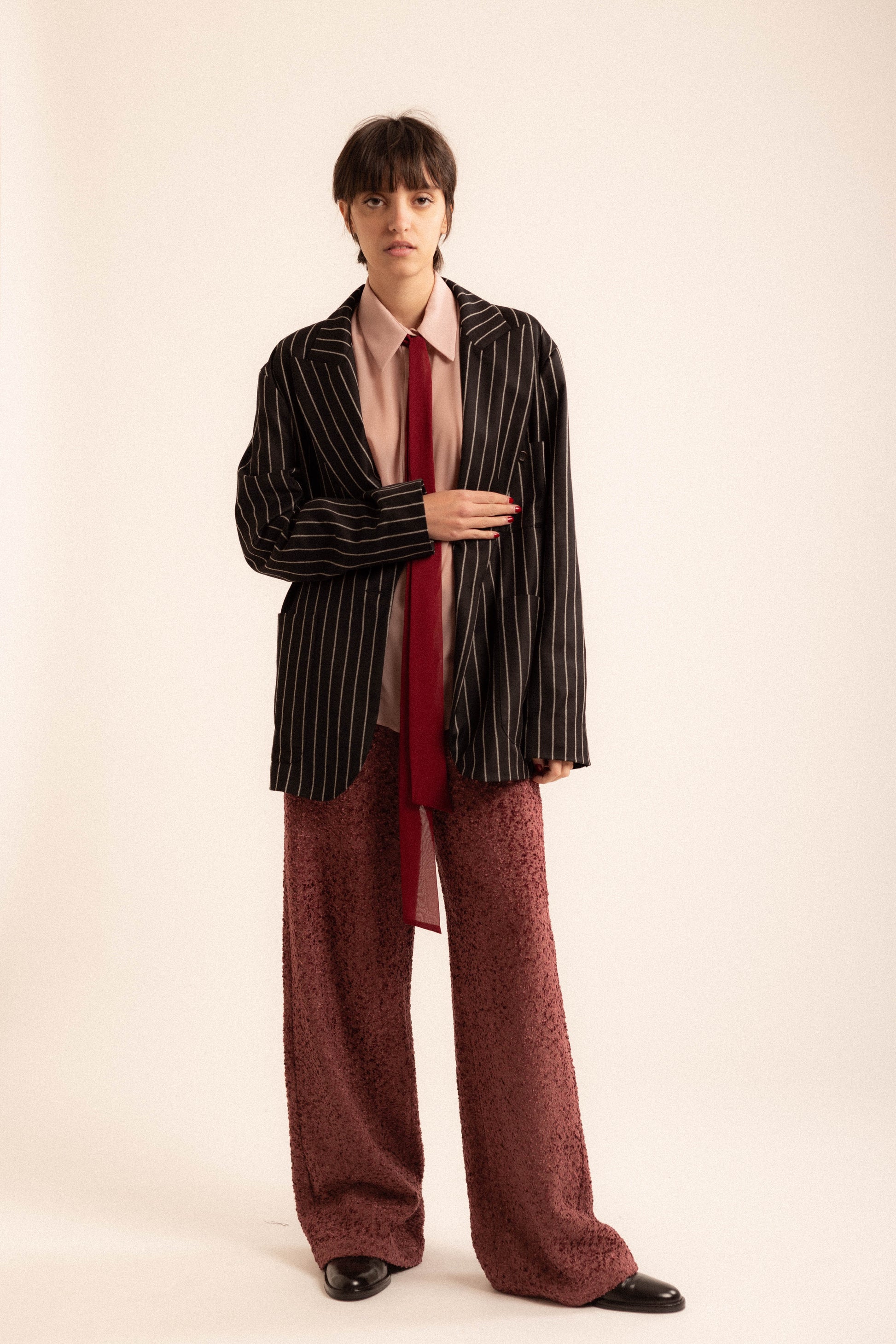 Questo elegante pantalone in bouclé di lana e viscosa color malva di tareastudio unisce comfort e stile in un design sofisticato. Caratterizzato da una vestibilità morbida e dritta, è perfetto per un look casual chic. Il dettaglio dell'elastico posteriore garantisce una vestibilità comoda e flessibile, adattandosi perfettamente al corpo. Il tessuto bouclé aggiunge texture e un tocco di raffinatezza al design. Questo pantalone è ideale per molteplici occasioni, sia per outfit quotidiani che per eventi più eleganti.