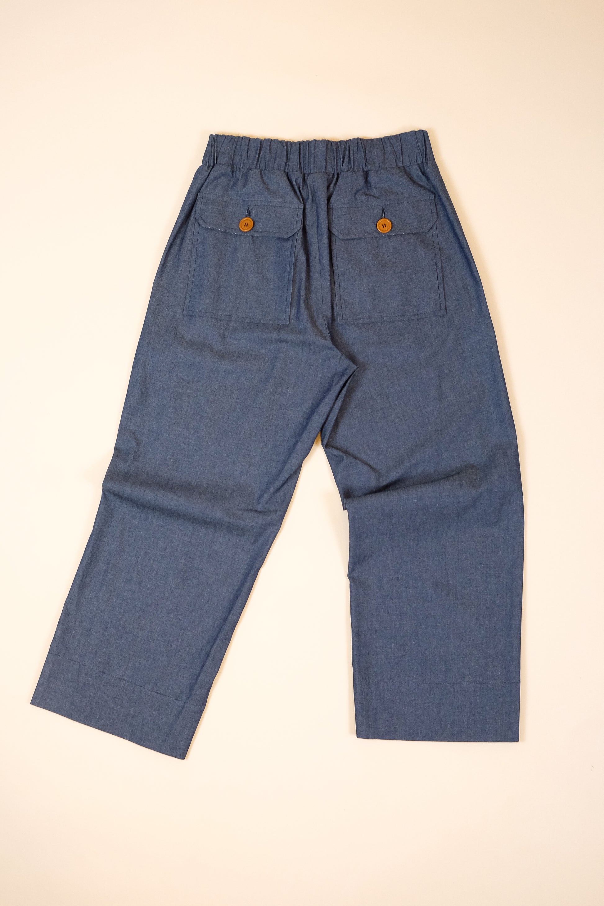 Vita elasticata. Tasche a toppa anteriori e posteriori. Le tasche dietro sono chiuse con pattina e bottoni a 4 fori in corozo. Gamba dritta, fondo ampio. Interno cintura rifinito in popeline rigato a contrasto.