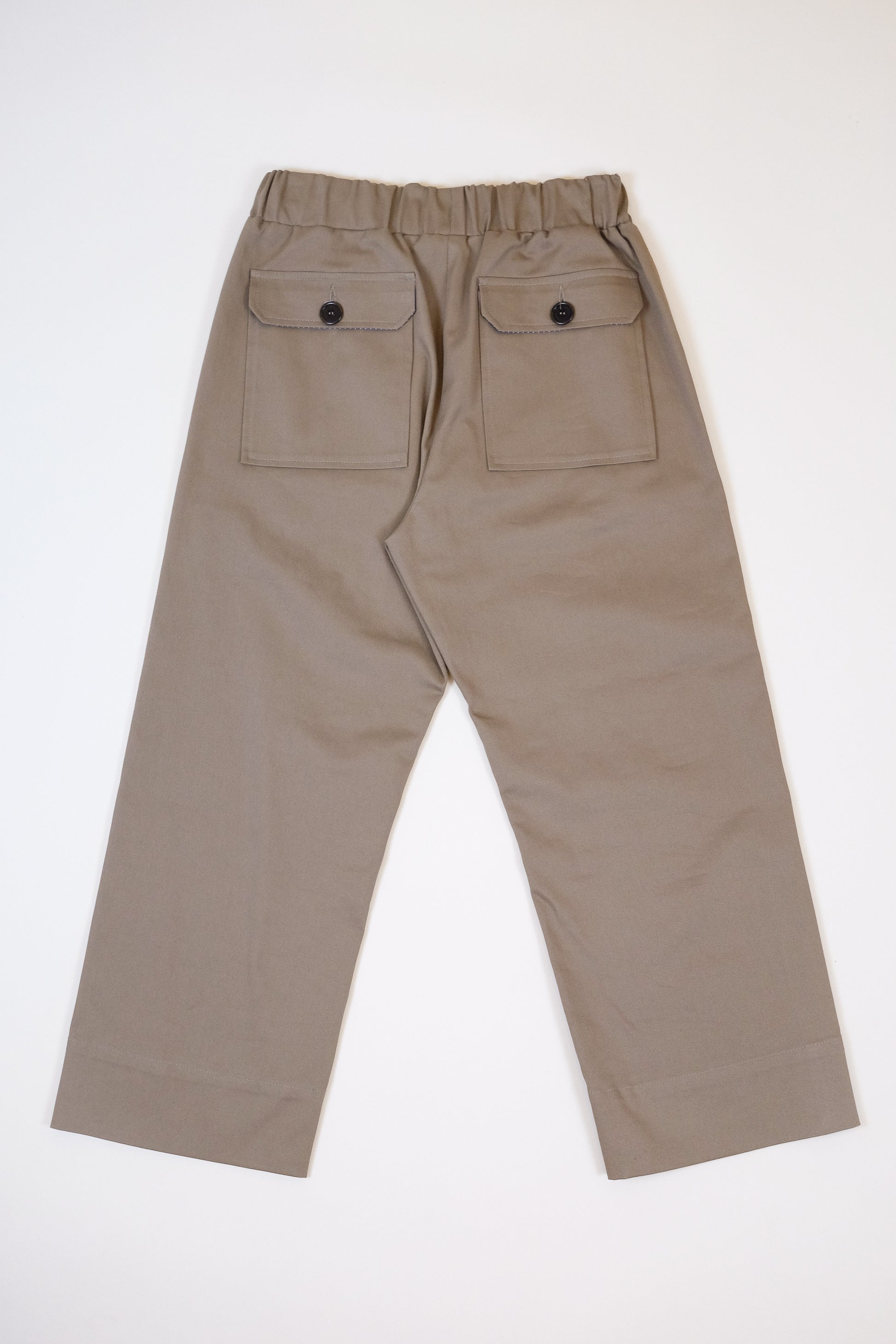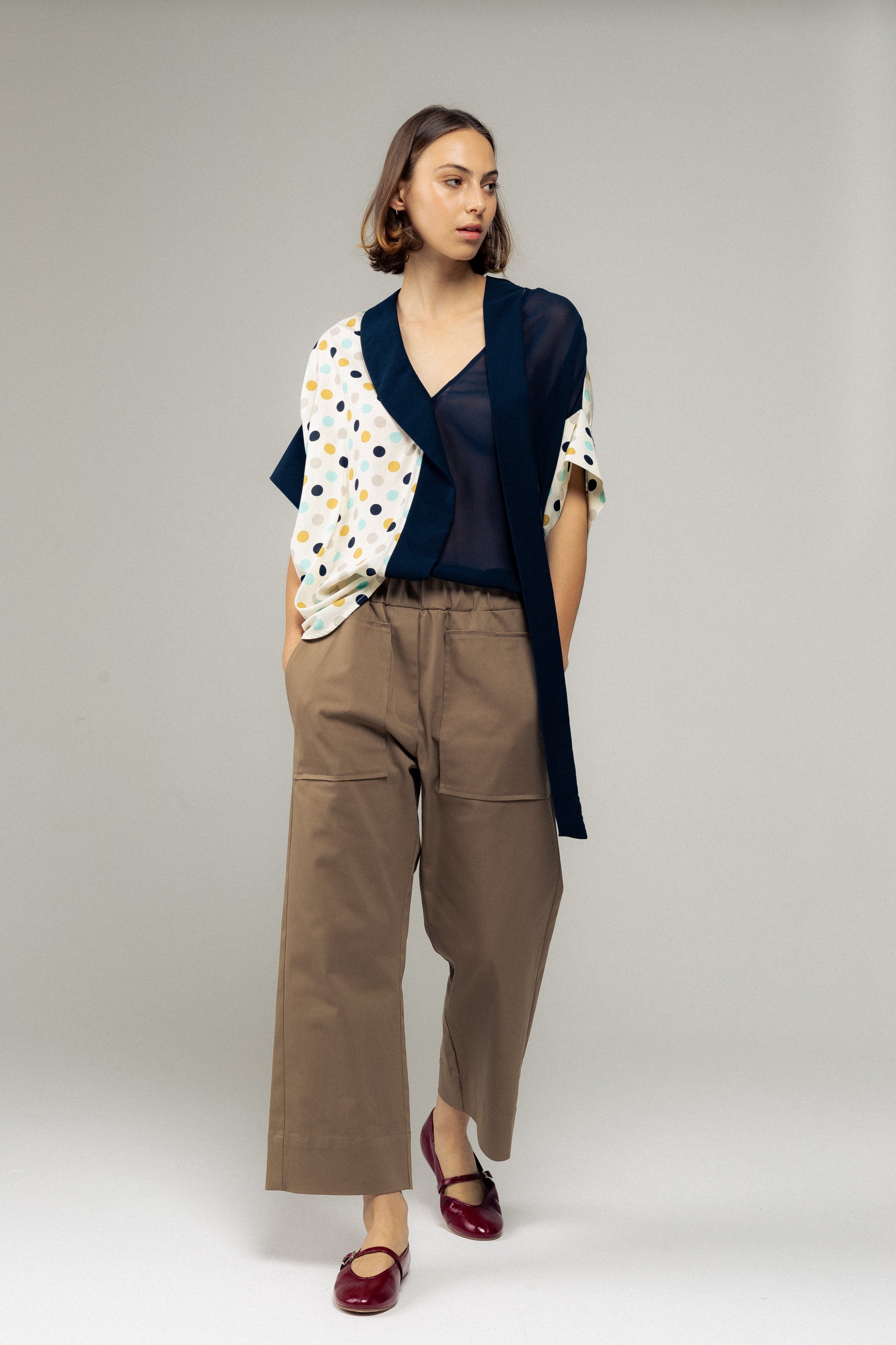 Vita elasticata. Tasche a toppa anteriori e posteriori. Le tasche dietro sono chiuse con pattina e bottoni a 4 fori in corozo. Gamba dritta, fondo ampio. Interno cintura rifinito in popeline rigato a contrasto.