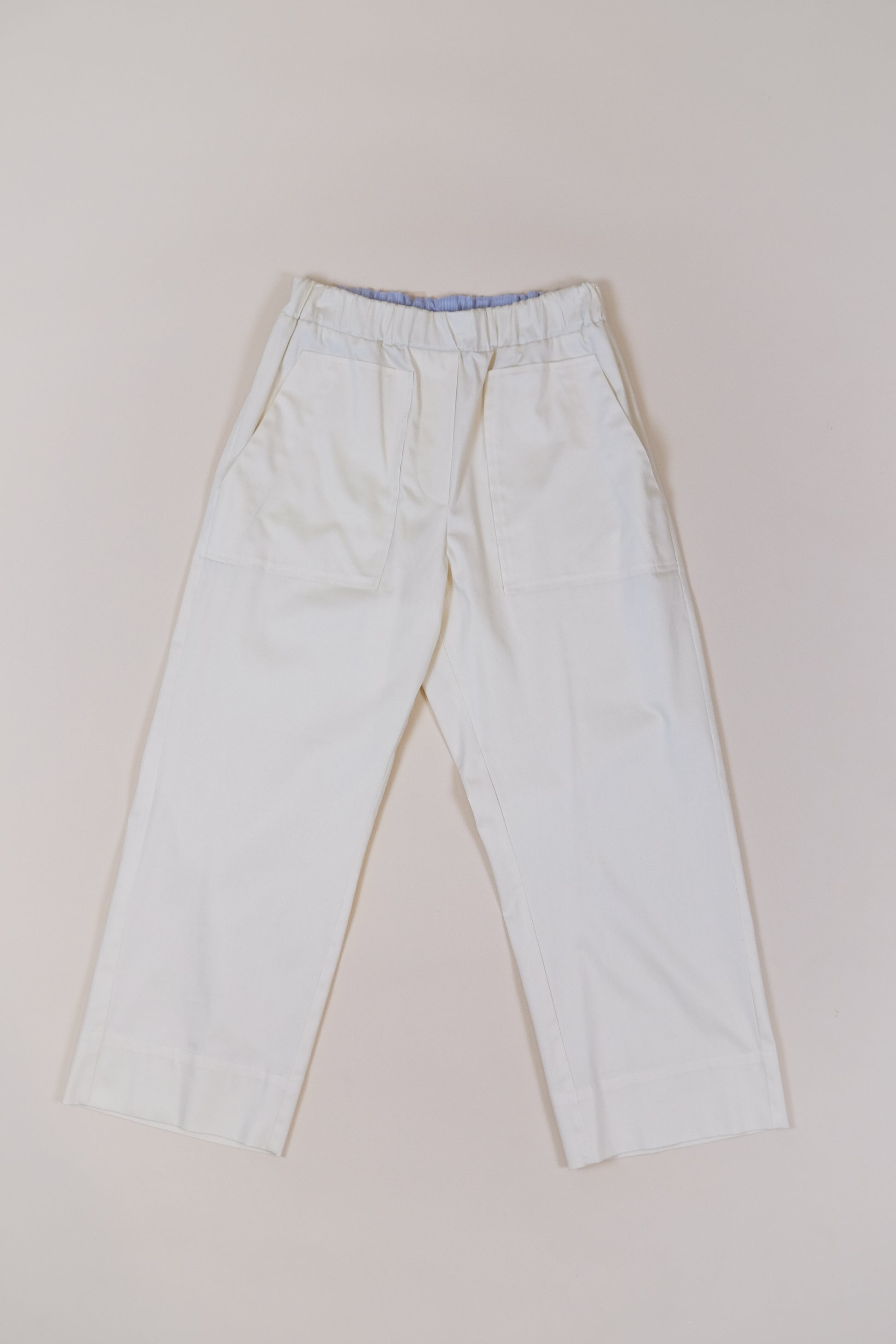 Vita elasticata. Tasche a toppa anteriori e posteriori. Le tasche dietro sono chiuse con pattina e bottoni a 4 fori in corozo. Gamba dritta, fondo ampio. Interno cintura rifinito in popeline rigato a contrasto.