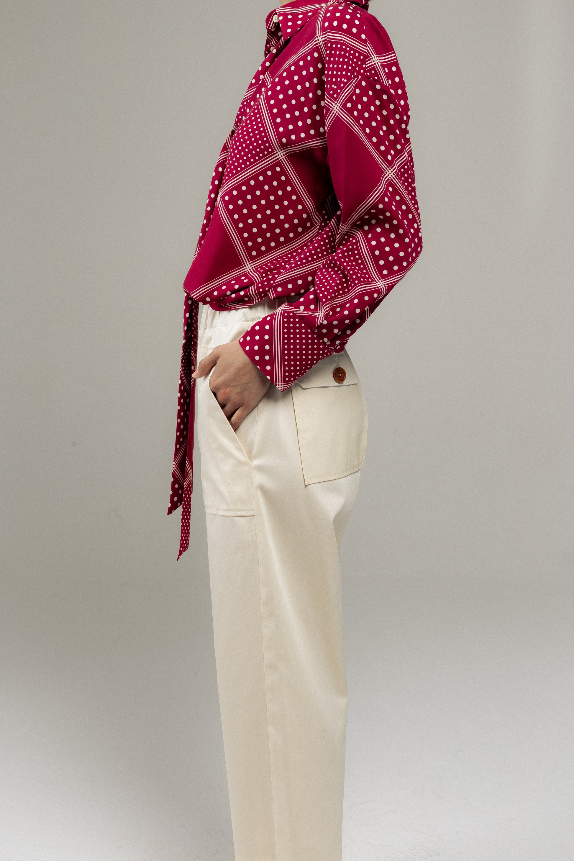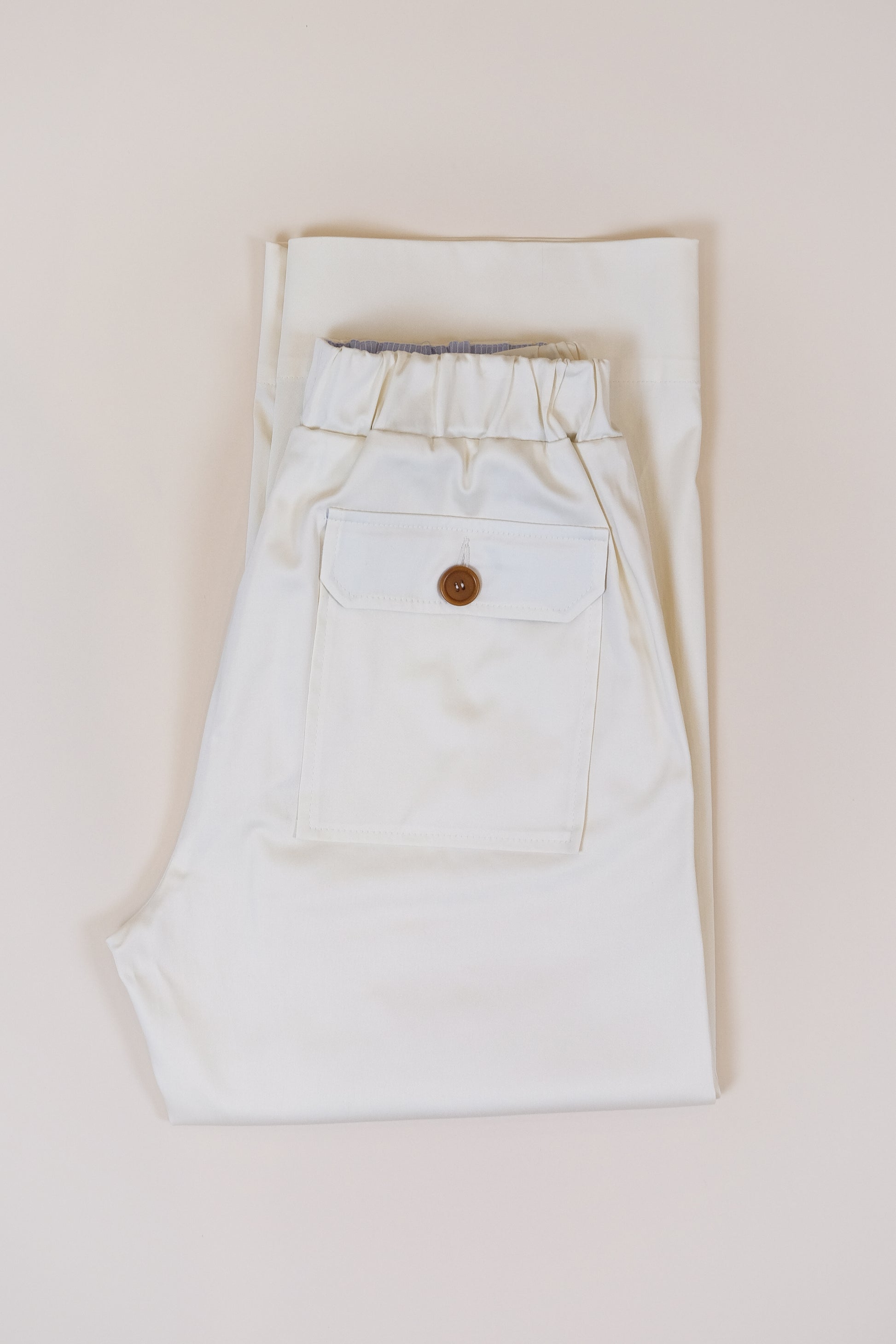 Pantalone cargo in rasatello di cotone color bianco naturale.